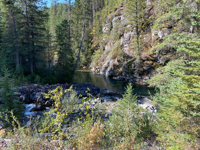 So Sulphur Creek FSR joins the Bull River FSR. Turns out it is one of the best known Fly fishing rivers around. I can see why. I stop and chat with a young fellow who is checking out every pool he can get too. Catch and release only but he is excited about the big one he is reeling in.